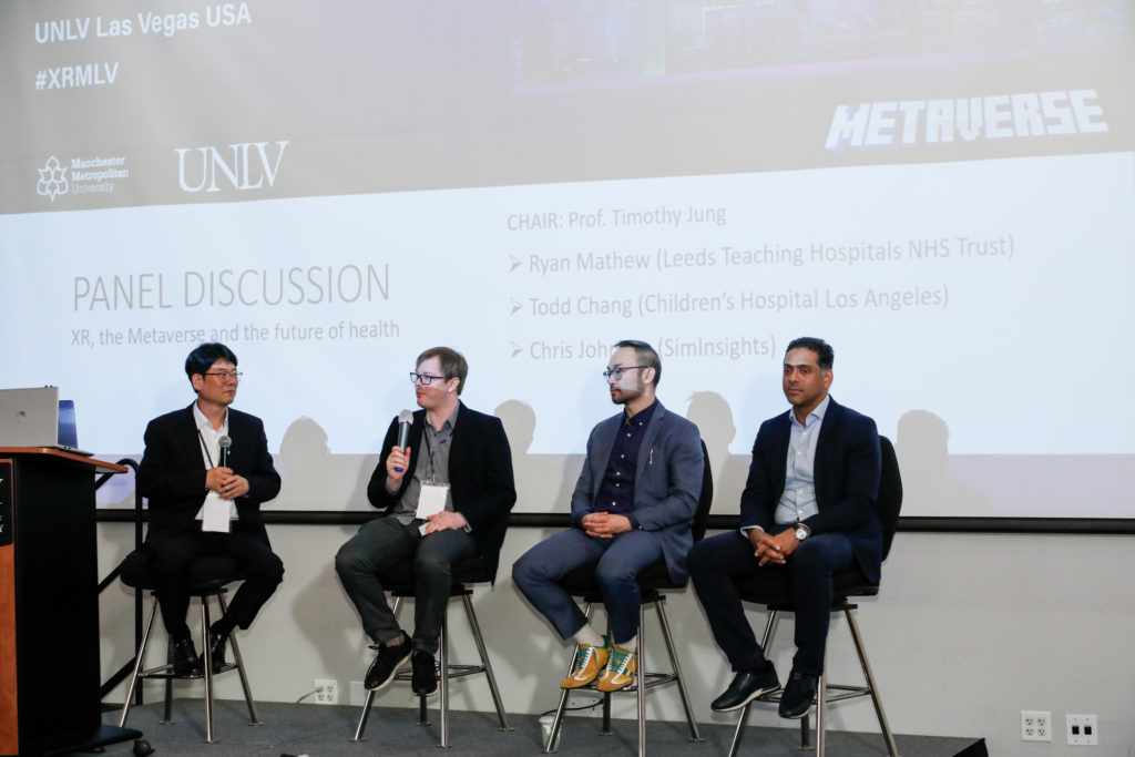 Johnson participated in a panel discussion on XR, the Metaverse and Future of Health , along with Ryan Mathew(Leeds Teaching Hospitals NHS Trust) and Todd Chang (Children’s Hospital Los Angeles). The panel was held on the second day of the conference and was moderated by Prof. Timothy Jung. During a discussion on healthcare and XR, one topic focused on SimInsight’s successful collaboration with UCLA in creating the Chaperone program. The Chaperone program, developed through XR technology, has proven to be effective in training medical professionals at UCLA with the necessary procedures to protect themselves, and their patients in more sensitive procedures. Todd Chang emphasized the importance of finding the right person to develop an XR program, emphasizing the need for expertise and understanding of both healthcare and XR technology. Ryan Mathews emphasized the significance of a well-structured development process to ensure the quality and effectiveness of XR applications in the healthcare space.